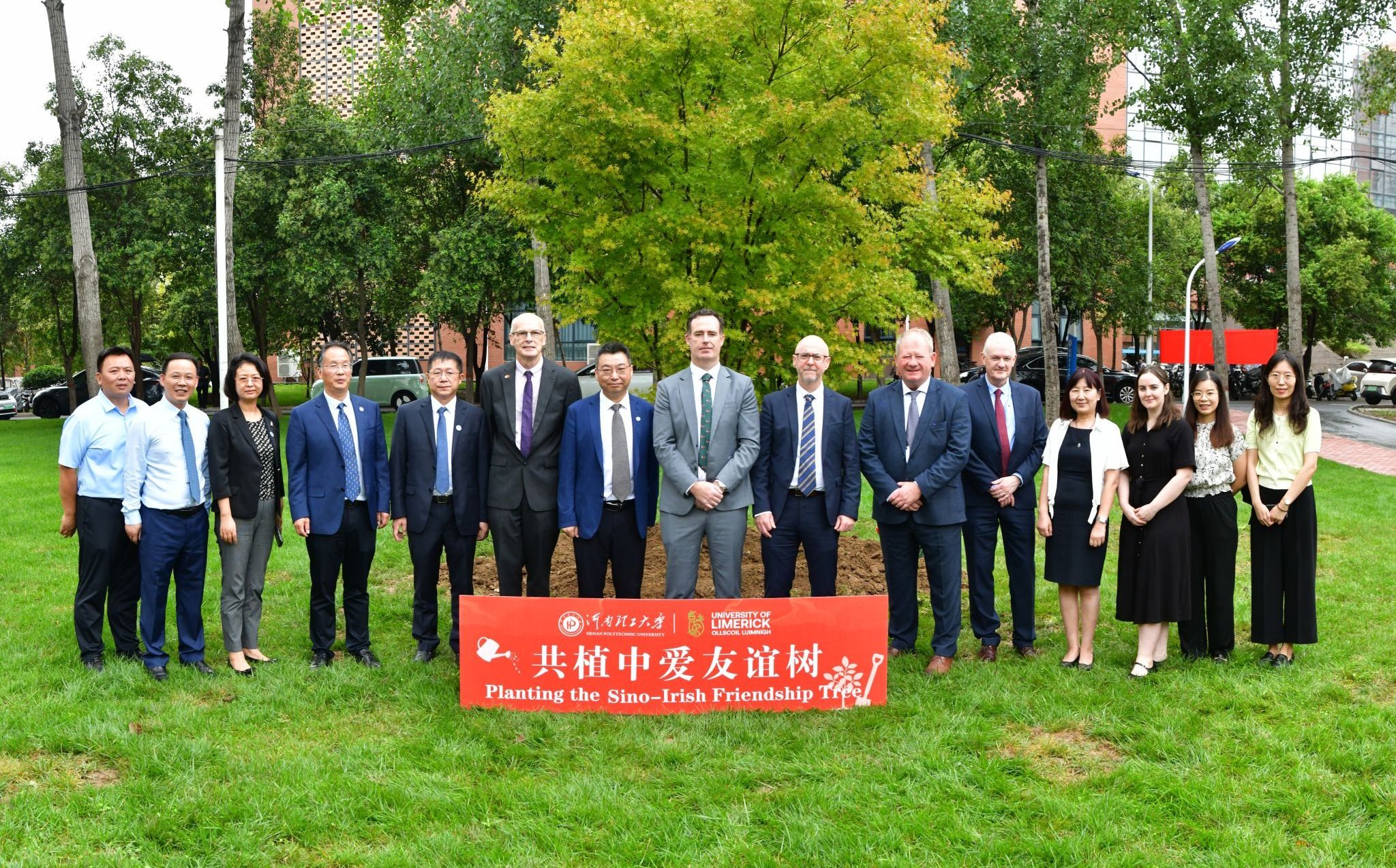楼前的草坪上栽下一棵象征友谊的纪念树,并与师生合影。这一活动寓意中爱两校之间的友谊与合作如树木般茁壮成长、四季常青。